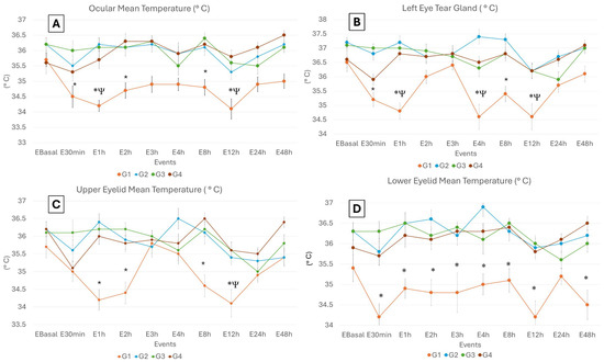 Temperatures (mean ± SE) of the four thermal windows at the evaluation events (E) of 64 female dogs undergoing elective ovariohysterectomy distributed into 4 study groups: G1, G2, G3 and G4. (A). Mean ocular temperature at E30min, E1h, E2h, E8h and E12h; the surface temperature of G2, G3 and G4 was significantly higher than G1. (B). Left eye tear gland. It can be observed that the surface temperature of G2, G3 and G4 was significantly higher at E1h, E4h, E8h and E12h than G1; however, G1 had significantly lower temperatures at E1h, E8h and E12h in contrast to EBasal. (C). Upper eyelid mean temperature. The surface temperature of G2, G3 and G4 was significantly higher at E1h, E2h, E8h and E12h than in G1, while G1 had lower temperatures at E12h than at EBasal. (D). Lower eyelid mean temperature. A significantly higher surface temperature was recorded in G2, G3 and G4 at E30min, E1h, E2h, E3h, E4h, E8h, E12h and E24h when compared to G1. * Indicates significant differences between treatments of the same event (p < 0.05), and Ψ indicates significant differences between events for the same treatment (p < 0.05).
