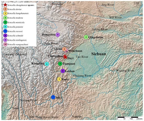 Sichuan Province in China is a recognized hotspot of herpetological diversity, hosting a considerable number of endemic species [17,18,19,20]. The varied topography and climatic conditions of the region create a mosaic of habitats that foster high levels of endemism and speciation. However, the herpetofaunal diversity of Sichuan remains inadequately studied, with extensive areas yet to be systematically surveyed. Preliminary investigations have identified several distinct lineages of Scincella, suggesting the presence of undescribed species. Currently, nine species of Scincella have been documented in Sichuan, including S. doriae (Boulenger, 1887), S. modesta (Günther, 1864), S. monticola (Schmidt, 1925), S. potanini (Günther, 1896), S. reevesii (Gray, 1838), S. schmidti (Barbour, 1927), S. tsinlingensis (Hu and Zhao, 1966), S. liangshanensis Jia, Ren & Wu, 2024, and S. wangyuezhaoi Jia, Gao, Huang, Ren, Jiang & Li, 2023. The latter two, recently described and endemic to Sichuan, underscore the remarkable biodiversity of the region and the untapped potential for further herpetological exploration [2,14,15,17,18,19,20] (Figure 1).