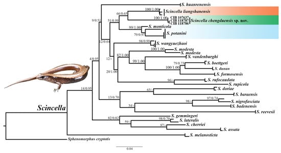 Specimens from the Chengdu population formed a distinct monophyletic clade within the genus Scincella, displaying substantial genetic divergence from all other congeners. This clade showed the closest relationship to the cluster comprising S. potanini, S. monticola, and S. liangshanensis (BPP = 51; BS = 0.99), although the topology was not fully resolved in the ML analysis. The combination of genetic distances and morphological traits strongly supported the distinctiveness of the Chengdu population.