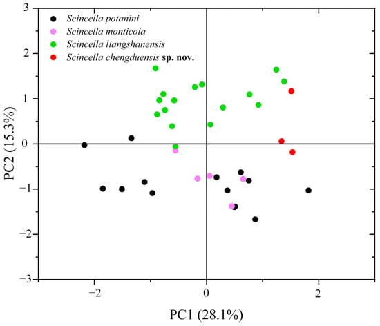 Scatter plot of PC1 and PC2 from PCA based on morphometric measurements, distinguishing the new species and its closely related species. Red, green, black, and light magenta plots represent Scincella chengduensis sp. nov., S. liangshanensis, S. potanini, and S. monticola, respectively.