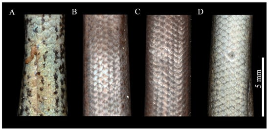 For other congeners also showing four dorsal scale rows between dorsolateral stripes, Scincella chengduensis sp. nov. differs from S. tsinlingensis (Hu and Zhao, 1966) and S. huanrenensis Zhao and Huang, 1982 by having fewer MBSR (23 vs. 26–28 and 25–28, respectively), fewer PVSR (57–60 vs. 60–75 and 66–79, respectively), fewer VSR + gulars (64–65 vs. 83–98 and 75–83, respectively), and fewer T4S (10–12 vs. 13–16) [48,49,50]; from S. schmidti (Barbour, 1927) [51] by having a shorter tail, TaL/SVL (1.59 vs. 1.90), fewer MBSR (23 vs. 26), fewer PVSR (57–60 vs. 66), fewer VSR + gulars (64–65 vs. 71), and fewer AGSR (52–58 vs. 60).
