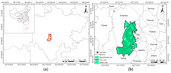 Geographic location of the Gongga Mountain National Nature Reserve (a) and the intensity distribution of the Luding earthquake (b).