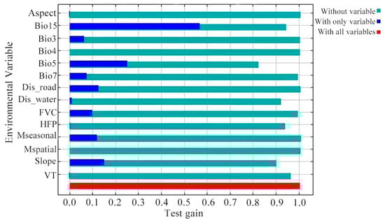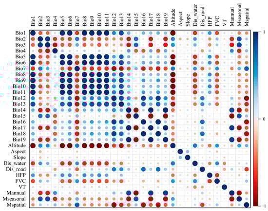 The coordinate system was unified (GCS_WGS_1984) and the spatial resolution was resampled (30 s, ~1 km2) in ArcGIS 10.8 software (ESRI Inc., Redlands, CA, USA, and the environmental variable layers were clipped according to the range of the GGMNNR. The raster data were uniformly converted into ASCII format as required by Maxent 3.4.4. To reduce multicollinearity and increase the accuracy of the prediction results, the environmental variables with high correlations but low contribution rates were removed before the model analyses [40]. A correlation analysis was performed using ENMTools.pl (https://github.com/danlwarren/ENMTools, accessed on 15 August 2024), and the correlation coefficients (Figure 3) were calculated [41]. The contribution rate of each variable was accessed in Maxent 3.4.4 by the jackknife method using the occurrence points and the 30 environmental variables [42]. The variables with very high correlations (|PCCs| ≥ 0.8) but low contribution rates (<1%) were removed [43]. If two variables were highly correlated, the variable that contributed the most to the model was retained. A total of fourteen environmental variables were finally selected to construct the final models, which included five bioclimatic, two meteorological, two vegetation, two human activity, and three geographical variables (Table 2).