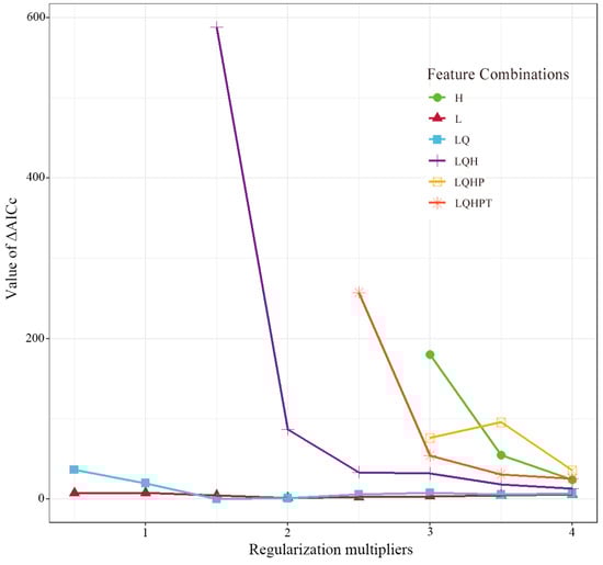 The use of default parameters can lead to over-fitting and high omission rates when implementing Maxent models [44]. The regularization multiplier (RM) and feature combination multiplier (FC; the combination of the feature types) parameters in Maxent were used to optimize the analysis of the model. There are the following five feature types in Maxent models: linear (L), quadratic (Q), hinge (H), product (P), and threshold (T). The delta from the Akaike information criterion with the correction (ΔAICc) values of the RM and FC were computed in R 4.3.3 software using the ENMeval package [45]. A smaller ΔAICc value indicates lower model complexity and a higher performance [45]. In this study, the range of RM was set from 0.5 to 4.0 at 0.5 increments, and six FC types (i.e., L, LQ, H, LQH, LQHP, and LQHPT) were selected. When the optimal model parameters were RM = 1.5 and FC = LQ, the ΔAICc value (= 0) was the lowest (Figure 4).