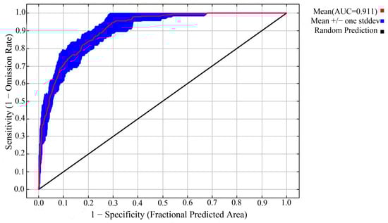 Under the optimal model parameters, an AUC value of 0.911 ± 0.019 was obtained for the ROC of the prediction results from Maxent (Figure 5), which indicated that the models had high predictive performance.