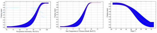 The importance of the environmental variables was evaluated using percent contribution (PC) and permutation importance (PI) (Table 2). The three environmental variables with the highest PC values were the precipitation seasonality (Bio15, 25.4%), maximum temperature of the warmest month (Bio5, 24.0%), and slope degree (slope, 12.1%), which accounted for 61.5% of the cumulative contribution. The three environmental variables with the highest PI were the maximum temperature of the warmest month (Bio5, 40.8%), precipitation seasonality (Bio15, 18.9%), and slope degree (slope, 11.1%), which accounted for 70.8% of the total. According to the jackknife test (Figure 6), the three most important environmental variables were the precipitation seasonality (Bio15), maximum temperature of the warmest month (Bio5), and slope degree (slope). The results from these methods indicated that the primary environmental variables influencing the distribution of the potentially suitable habitat for the Batrachuperus species in the GGMNNR were the precipitation seasonality (Bio15), maximum temperature of the warmest month (Bio5), and slope degree (slope). Based on the response curves of the major environmental variables (Figure 7), the optimal ranges for the precipitation seasonality (Bio15), maximum temperature of the warmest month (Bio5), and slope degree (slope) for the Batrachuperus species in the GGMNNR were > 92%, 14–22 °C, and 0–35°, respectively.
