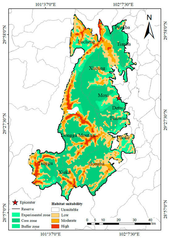 The effect of the earthquake on the area of potentially suitable habitat was analyzed based on the superposition of the suitable habitat layer and the region destroyed by the earthquake. The spatial distribution characteristics of the area of suitable habitat destroyed were analyzed. All of these steps were carried out in ArcGIS10.8 software (ESRI Inc., Redlands, CA, USA).