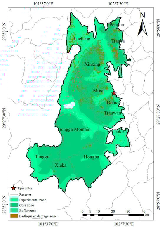 Distribution of the earthquake-destroyed regions in the Gongga Mountain National Nature Reserve.