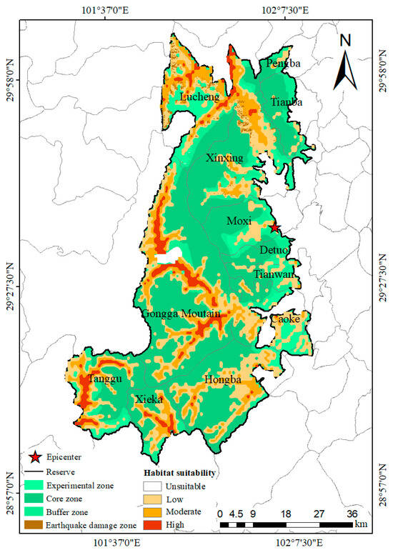 A total of 1.97% (32.78 km2) of suitable habitat was destroyed by the earthquake, including 0.01 km2 of highly suitable habitat, 3.21 km2 of moderately suitable habitat, and 29.56 km2 of habitat with low suitability. These destroyed habitats were mainly located in Lucheng Town, the Xinxing township, the Gongga Mountain township, Moxi Town, the Caoke township, and the Tianwan township (Figure 10).