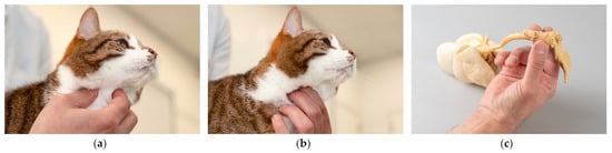 Purring is a typical sound that only cats produce among domesticated companion animals, and it is created by an intermittent activation of the intrinsic laryngeal muscles via self-sustaining vocal fold oscillations [1,2]. The biological function of purring is still poorly understood. Cats can purr under various circumstances, such as when they feel comfortable or when they are in social situations, like when interacting with kittens, with other cats or with humans. However, they can also purr during unpleasant, stressful or painful situations, such as during examinations or procedures in veterinarians’ consultation rooms [3,4,5]. During physical examinations, purring might interfere with auscultation of the heart and lungs, making it impossible to meaningfully perform this important diagnostic test if the purring sound is loud enough [3].