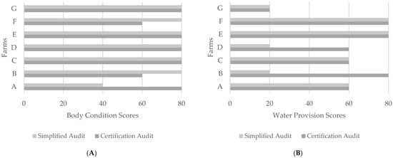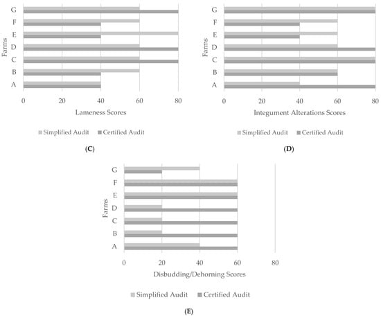 The results of the five indicators measured at both audits (body condition, water provision, lameness, integument alterations, and disbudding/dehorning) are shown in Figure 2A–E by the farm (A–G).