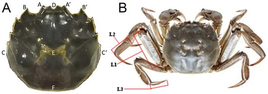 Distance measures applied to the back of carapace (A) and ambulatory legs of Eriocher sinensis (B). Definition of each measurement parameter: C1: C (C′), width of carapace; C2: DF, length of carapace; C3: A (A′), width of frontal; C4: B (B′), width of the first anterolateral tooth; C5: EF, length of the posterior half of carapace. L1: the longest dactylus length of the third ambulatory leg; L2: the frontier dactylus length of the third ambulatory leg; L3: the dactylus length of the last ambulatory leg.