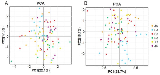 PCA analysis of male (A) and female (B) Eriocheir sinensis from six regions based on morphological proportion traits; YY—Yongyan in Anhui province, PJ—Panjin in Liaoning province, HZ—Huzhou in Zhejiang province, JX—Jinxian in Jiangxi province, CZ—Changzhou in Jiangsu province, EZ—Ezhou in Hubei province.