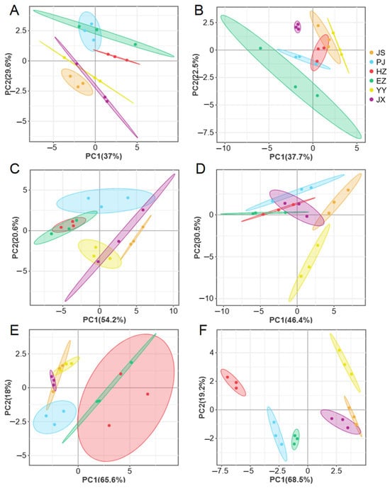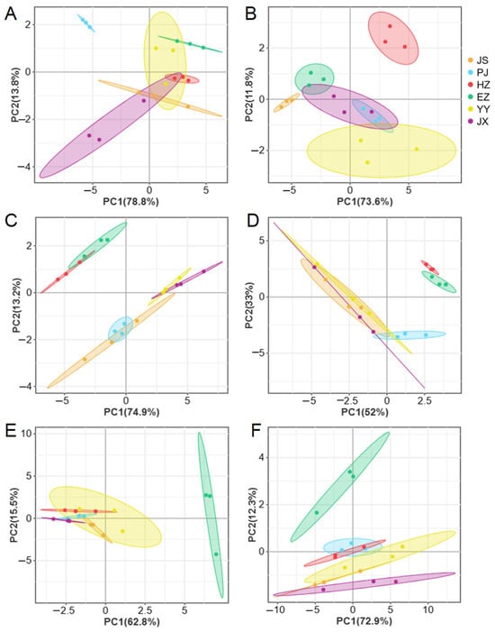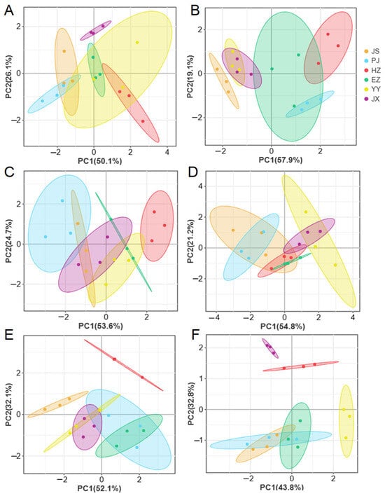 PCA analysis of male (A,C,E) and female (B,D,F) Eriocheir sinensis from six regions based on proximate composition of muscle (A,B), hepatopancreas (C,D), and gonad (E,F) tissues. YY—Yongyan in Anhui province, PJ—Panjin in Liaoning province, HZ—Huzhou in Zhejiang province, JX—Jinxian in Jiangxi province, CZ—Changzhou in Jiangsu province, EZ—Ezhou in Hubei province.