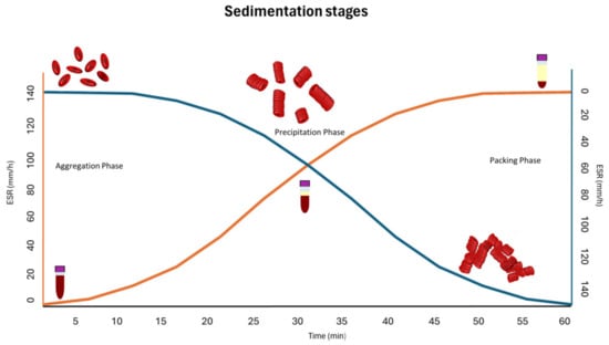 Three phases of the erythrocyte sedimentation process can be distinguished (Figure 1) [,]. The first phase (lag phase) is called aggregation, which includes the few minutes necessary for erythrocytes to adhere to each other in order to build aggregates, which are called rouleaux. The surface of the RBC is negatively charged by sialic acid molecules of the membrane proteins. RBCs, therefore, repel each other, but at the same time, the Van der Waals forces bring them together, creating an equilibrium status. In the next phase, called precipitation or sedimentation, RBCs fall more rapidly at a constant speed, and the deposition increases. In this phase, the ESR can be described by applying the modified Stokes law. This equation calculates the settling speed of a single particle such as an RBC in a fluid []. The Stokes law was modified to include the hindered settling effect caused by the interference of upward flow on the sedimentation speed. In the third phase, called packing, the rouleaux aggregates pile up at the bottom of the tube.