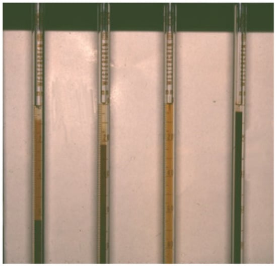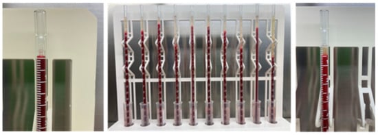 The Westergren is the current reference method for measuring the ESR. It has been recommended and standardized in human medicine by the International Council for the Standardization of Hematology (ICSH) in several consecutive guidelines published over four decades [,,,,,]. According to this method, the blood sample drawn by venipuncture is promptly diluted with sodium citrate (ratio 4:1) and gently mixed, ensuring that no hemolysis and bubbles occur. The diluted blood is then aspirated into graduated glass pipettes. These pipettes need to stand vertically on a rack for one hour (Figure 2). During sedimentation, the pipettes should be kept at a constant temperature (18–25 °C ± 1), away from vibrations and direct light. After one hour, the sedimentation is calculated as a measure of the height of the constituted clear plasma column at the top of the pipettes. This is expressed in millimeters per hour; the ESR, thus, represents the speed of the flow [,,,,,].