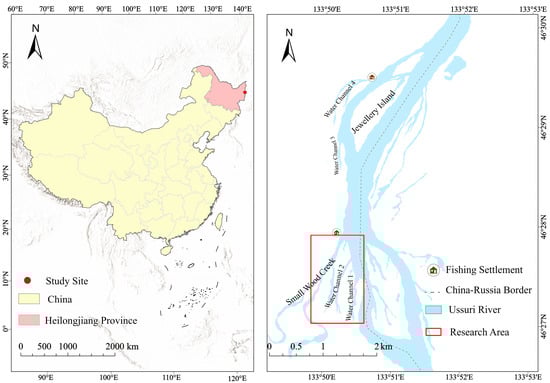 (Left) Map of Heilongjiang Province, China. The study site is marked by a red dot. (Right) The study area and its surroundings on the Ussuri River. A red square indicates the sampling area. The map was constructed using ArcGIS Pro 3.2 [15].