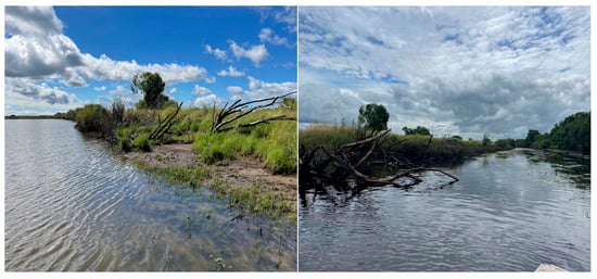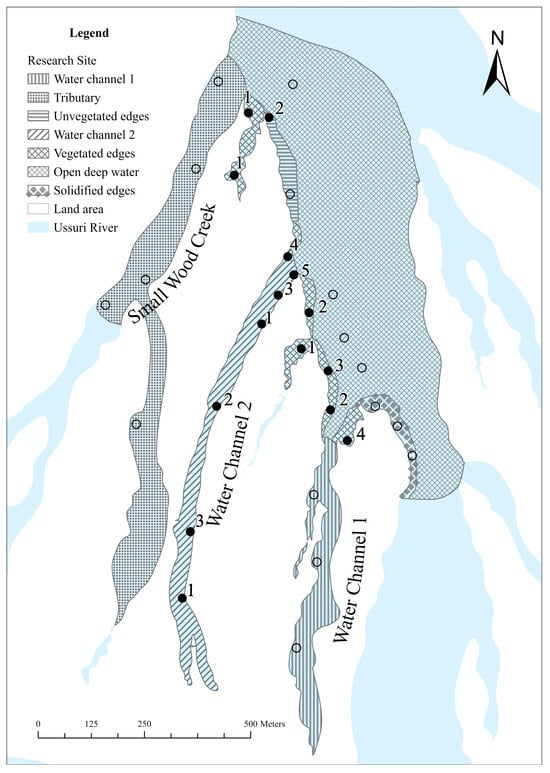 The study was conducted near the Jewellery Island (45°52′–45°17′ N, 133°28′–133°47′ E) in the Ussuri River, Heilong Jiang Province, China (Figure 1). Sampling was conducted in the region south of Jewellery Island, encompassing two primary water channels and a tributary known as Small Wood Creek. Shallow water areas (<1.5 m) were near the shoreline and composed most of water channel 2, while the water depth in water channel 1 and Small Wood Creek was relatively deep (<2.5 m and <3 m, respectively). Most of the main watercourse of the Ussuri River ranged between 3 and 6 m deep. The bottom was mainly composed of mud and sand, with a prevalence of sandy sediment at the shoreline of the main watercourse and sandy gravel in the upper sections of the Small Wood Creek. Predominant vegetation types along the shoreline included willows (Salix sp.), reeds (Phragmites sp.), and sedges (Cyperus sp.) (Figure 2). Most of the study area showed few signs of human activities, with only a small altered portion of the shoreline characterized by piles of large boulders in the south. The area is bordered by extensive wilderness with minimal impact from human activity, although fishermen frequently visit the area. A settlement of fishermen is located in the northern part of the sampling area near the mouth of the Small Wood Creek. The Ussuri River serves as the border between Russia and China. Owing to jurisdictional limitations, our study was restricted to the Chinese side of the river, and our findings mainly represent the situation on this side of the Ussuri River.