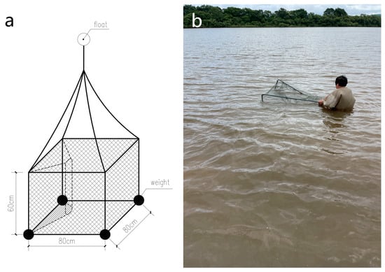 A capture-mark-recapture study was carried out during the summer months of 2022 (from late June to early October), coinciding with most peak activity periods of ASTs in this region. In the sampling area, 31 specially designed traps were strategically distributed according to distribution of habitat types in the Ussuri river and its immediate tributaries. Traps were 80 × 80 × 60 cm, with an 80 × 60 cm entrance constructed to accommodate the largest adult turtle (Figure 3a). Each time a trap was deployed, a Garmin 60 CSX global positioning system (GPS map 78 s, Garmin International Inc., Olathe, KS, USA) was used to record its positions.