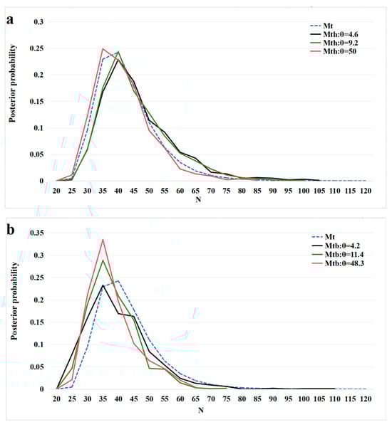 (a) Posterior densities of N for the data using the Mt and Mth model. (b) Posterior population size of N for the data using the Mt and Mtb model. θ denoted the proposed default prior choice [17].