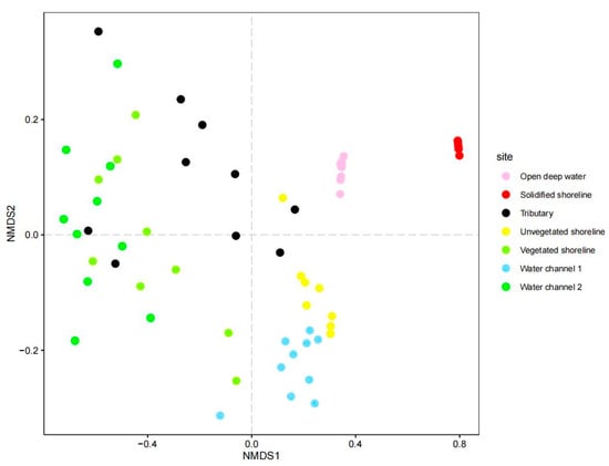 Almost all ASTs were captured on the vegetated shoreline and water channel 2, confirming the significance of these two areas for the survival of ASTs in this region. The Bonferroni confidence intervals (95%) indicated that the proportion of vegetated shorelines used was not statistically significant; however, this may be due to the excessive error introduced by the small sample size. NMDS revealed that the sample plots of the vegetated shoreline and water channel 2 had similar characteristics and were largely nested together, and both regions had relatively higher water plant coverage, woody debris, canopy, and low current. The woody debris was mainly comprising dead wood and some living tree branches and root systems. This environment may be a refuge and retreat for juvenile ASTs and hosts various small animals (including insect larvae, crustaceans, mollusks, snails, amphibians, and fish) [47,48], which are potential prey for the turtles [49]. Additionally, water channels and submerged wood-abundant vegetated shorelines provide some of the few slow-velocity water current bodies, apart from the main watercourse, that are essential for the well-being of softshell turtles [50].