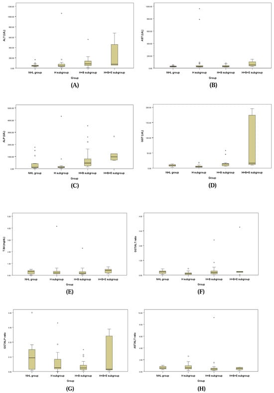 The hepatobiliary profiles assessed for underlying biliary disease for the NHL group and the three subgroups of the HL group are presented in Table 6 and Figure 1. ALT, ALP, and GGT levels showed a statistically significant tendency to be higher in the H + B subgroup and H + B + E subgroup compared to the NHL group and H subgroup. Additionally, the GGT/ALT ratio (GGT/ALT) demonstrated a statistically significant increase in the NHL group and H + B subgroup compared to the H subgroup, while the AST/ALT ratio (AST/ALT) showed a statistically significant increase in the H + B subgroup compared to the NHL group and H subgroup.