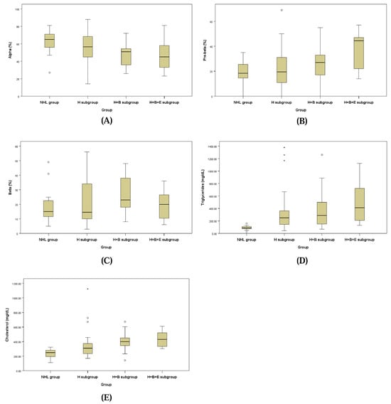 The lipid fraction profiles assessed by LPE for the NHL group and the three subgroups of the HL group are presented in Figure 2 and Table 7. Each lipoprotein fraction displayed a distinct trend, with the alpha fraction decreasing and the pre-beta fraction increasing progressively from the NHL group to the H + B + E subgroup of the HL group.