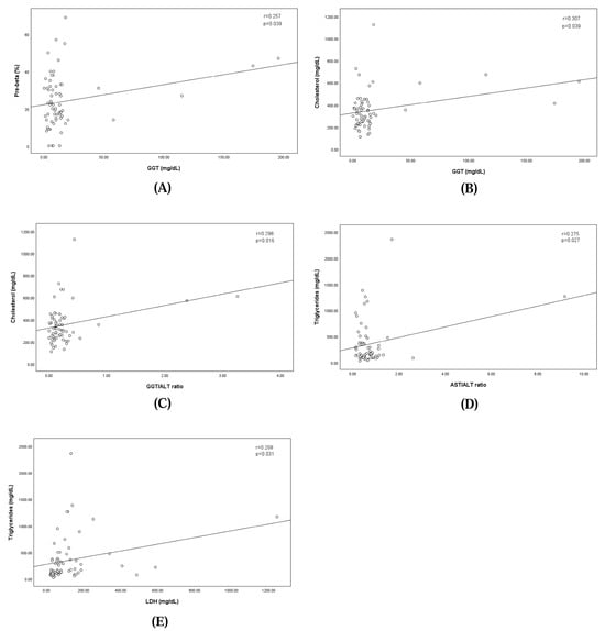 The analysis revealed a significant positive correlation between GGT levels and the pre-beta fraction, indicating that higher GGT levels were correlated with an increase in the pre-beta fraction (regression equation: pre-beta fraction = 22.115 + GGT × 0.108; correlation coefficient: 0.257; p = 0.039). Similarly, GGT levels showed a significant positive correlation with cholesterol levels, where elevated GGT levels corresponded to higher cholesterol concentrations (regression equation: cholesterol = 325.105 + GGT × 1.506; correlation coefficient: 0.307; p = 0.039). The GGT/ALT ratio showed a significant positive correlation with cholesterol levels, where the elevated GGT/ALT ratio corresponded to higher cholesterol concentrations (regression equation: cholesterol = 324.629 + GGT/ALT ratio × 101.871; correlation coefficient: 0.298; p = 0.016). The AST/ALT ratio showed a significant positive correlation with cholesterol levels, where the elevated GGT/ALT ratio corresponded to higher cholesterol concentrations (regression equation: triglyceride = 274.963 + AST/ALT ratio × 100.832; correlation coefficient: 0.275; p = 0.027).