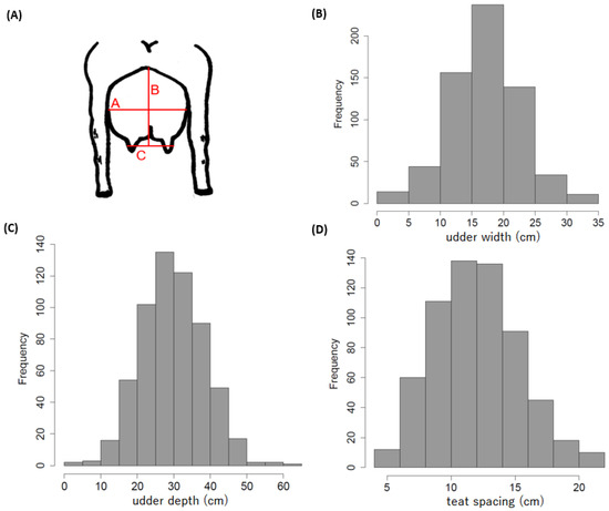 Frequency distribution of phenotypic variation of three udder traits in this study. (A) illustrates the phenotypic representation of the measured udder traits, where A corresponds to udder width, B corresponds to udder depth, and C corresponds to teat spacing. (B–D) represent the frequency distributions for udder width, udder depth, and teat spacing, respectively.