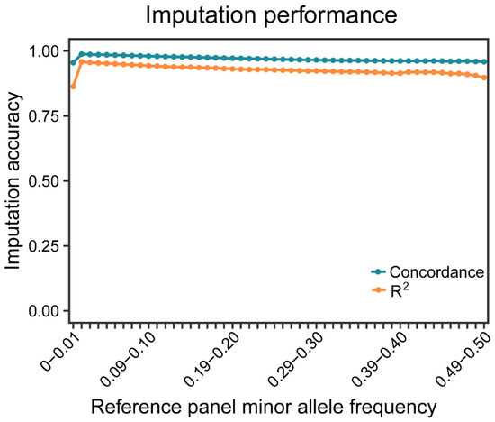 Previous studies have demonstrated the effectiveness of QUILT with lcWGS data; however, its performance slows down with larger reference panel sizes [40]. GLIMPSE2 imputation software was assessed for both speed and accuracy of imputation to enhance imputation efficiency [41]. Considering the absence of a large publicly available reference panel of goats, we have established a new reference panel consisting of 1232 goats. The sequencing depth of goats lcWGS was around 1.95×, and there are 14,717,075 high-quality SNPs in the final genomic dataset after imputation. Moreover, imputation accuracy was also investigated using a recently referenced panel for the lcWGS in Saanen dairy goats. Twenty randomly selected samples were subjected to high-coverage resequencing (10×) to generate the true set, which was then compared to corresponding imputed samples. We estimated the imputation accuracy through Pearson correlation coefficient (R2) and concordance. Our findings demonstrated an average accuracy of 97.3% and a correlation rate of 92.8% between the imputed dataset and the ground truth dataset, indicating that the established reference panel exhibits excellent imputation accuracy for lcWGS data in Saanen dairy goats, thus making it suitable for future studies (Figure 2).