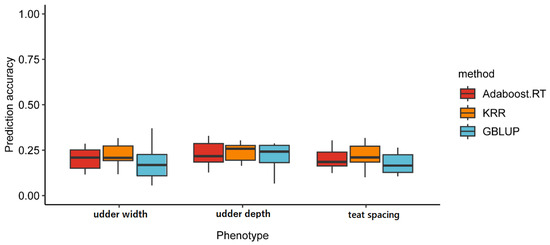 An advantage was found in applying ML methods (KRR and Adaboost.RT) over GBLUP for udder width, udder depth, and teat spacing in Saanen dairy goats (Figure 3). For udder width, the prediction accuracy of KRR, Adaboost.RT, and GBLUP were 0.22 ± 0.07 (95% CI: [0.18, 0.26]), 0.20 ± 0.06 (95% CI: [0.16, 0.23]), 0.18 ± 0.10 (95% CI: [0.12, 0.24]). The improvement achieved by ML methods over GBLUP was 22% and 11%. For udder depth, the prediction accuracy of KRR, Adaboost.RT, and GBLUP were 0.24 ± 0.05 (95% CI: [0.21, 0.27]), 0.23 ± 0.07 (95% CI: [0.19, 0.27]), and 0.22 ± 0.08 (95% CI: [0.17, 0.27]), and the improvement achieved by ML methods over GBLUP was 9% and 5%. Similarly, compared to GBLUP (0.17 ± 0.06) (95% CI: [0.13, 0.21]), the accuracy of KRR (0.22 ± 0.07) (95% CI: [0.18, 0.26]) and Adaboost.RT (0.20 ± 0.06) (95% CI: [0.16, 0.24]) has 29% and 18% improvement for teat spacing. The accuracy of Adaboost.RT is similar to that of KRR, both demonstrating the highest level of predictive accuracy.