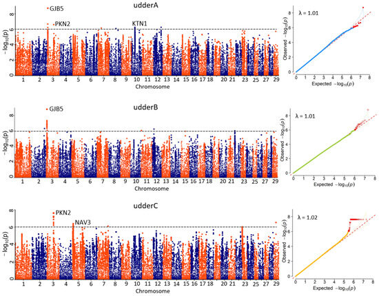 Manhattan plots and QQ plots of GWAS for udder size traits of Saanen dairy goats, using the lcWGS in 635 Saanen dairy goats. On the left side of the graph, p-values (−log10 (p)) for each SNP are plotted on the Y-axis, with chromosomes ranging from 1 to 29 displayed on the X-axis. The dotted line indicates the threshold of genome-wide significance. On the right side of the graph, the horizontal axis displays the −log10 transformed expected p-values, while the vertical axis represents the −log10 transformed observed p-values. These values are plotted against the expected p-values under the null hypothesis of no association, include red dots that represent genetically variant sites which are statistically significant.