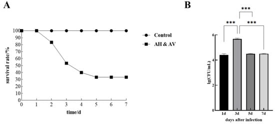 Survival curve and hepatic bacterial load changes in grass carp co-infected with A. hydrophila and A. veronii. (A) Survival curve of grass carp co-infected with A. hydrophila and A. veronii. (B) Changes in hepatic bacterial load in grass carp co-infected with A. hydrophila and A. veronii.(“***” indicates p < 0.001).