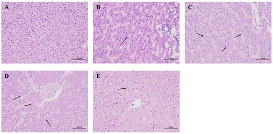 For the histopathological examination, the liver was fixed in 4% paraformaldehyde. Briefly, tissues were dehydrated through a graded ethanol series, embedded in paraffin wax, sectioned at 5 μm thickness, and stained with hematoxylin and eosin (H&E) []. Histological changes were examined and photographed using a light microscope.
