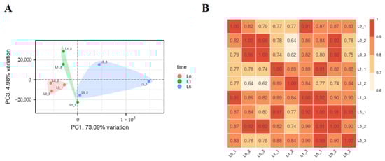 Sample relationship analysis. (A) Principal component analysis (PCA) of the genes in terms of variance across samples. (B) Sample correlation heat map.