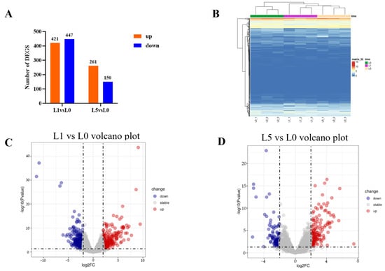 DEGs expression analysis. (A) Summary of differential gene expression between two experimental groups. (B) Expression pattern clustering analysis of differentially expressed genes. (C) Volcano plot of DEGs in the L1 vs. L0 group. (D) Volcano plot of DEGs in the L5 vs. L0 group.