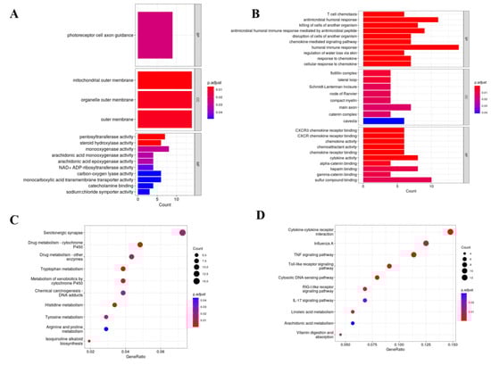 GO and KEGG function enrichment analysis of DEGs. (A) GO function enrichment analysis of the L1 vs. L0 group (top 10 enriched terms). (B) GO function enrichment analysis of the L5 vs. L0 group (top 10 enriched terms). (C) KEGG function enrichment analysis of the L1 vs. L0 group (top 10 enriched terms). (D) KEGG function enrichment analysis of the L5 vs. L0 group (top 10 enriched terms).