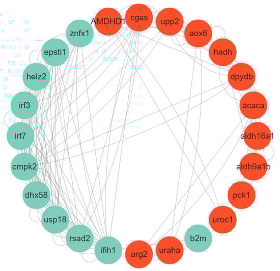 KEGG pathway enrichment analysis revealed significant dysregulation of metabolic and immune-related genes during infection. Notably, metabolic genes (amdhd1, aox1, urah, aldh16a1, and hadh) showed substantial suppression, while immune-related genes (irf3, irf7, epsti1, znfx1, cmpk2, cxcl11, and rsad2), were significantly activated in infected specimens (Table 2). Protein–protein interaction analysis demonstrated extensive crosstalk between these dysregulated metabolic and immune pathways during bacterial infection (Figure 6).