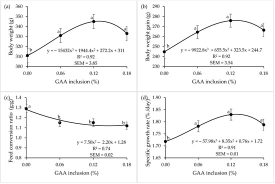 The effects of increasing addition levels of dietary guanidinoacetic acid on rainbow trout performance at 90 d. (a) Body weight, (b) body weight gain, (c) feed conversion ratio, and (d) specific growth rate. a,b Values within a curve not sharing a common superscript differ regarding the effect of increasing addition levels of GAA (p ≤ 0.05) by Tukey.