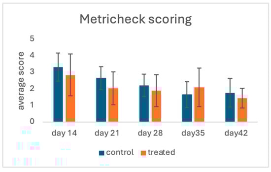 In both groups, the average Metricheck score declined in a time-dependent manner. Between days 14 and 42, a reduction rate of almost 50% was recorded in both groups. Although no statistically significant difference was observed at any time point, in group T the mean score was steadily numerically lower than that of group C and tended to differ (p = 0.1) on day 28, (Figure 1).