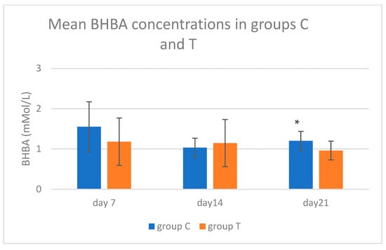 Mean BHBA concentrations on different sampling days in control and treated groups. Asterisk (*) denotes statistical difference (p < 0.05).