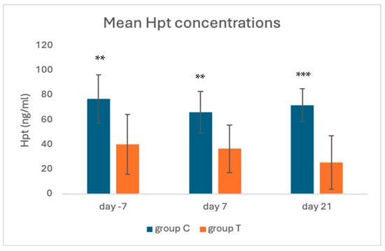 Mean Hpt concentrations in groups C and T, on different sampling days. ** p < 0.001, *** p < 0.0001.