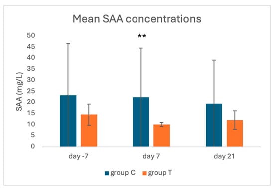 Mean SAA concentrations in groups C and T, on different sampling days. ** p < 0.001.