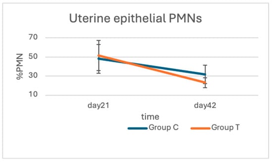 Based on PMN counts and the Metricheck score, both groups exhibited mild endometritis at the initial examination (day 21). Current understanding posits that PMNs constitute a critical first line of defense against pathogens and are vital components of the innate immune response. These cells migrate from the vascular compartment to sites of inflammation to kill or phagocytize bacteria [], but they can also contribute to the pathogenesis of conditions characterized by disturbed tissue homeostasis, such as trauma and shock []. The earlier restoration of ovarian resumption in group T denotes that these animals were exposed to high estrogen levels earlier than those of group C. It is well established that estradiol stimulates vascularization of the endometrium [,], enhances uterine contractility [], initiation of sexual receptivity [], and supports sexual-specific effects on the secretory immune system []. It is, therefore, logical to assume that, at least partly, the faster clearing of the endometrium in group T could be attributed to the early exposure to estrogens.