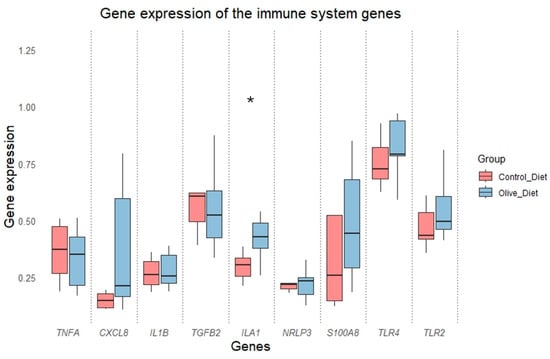 Among the nine genes under study, only one gene showed differential gene expression between the two groups, ILA1, which exhibited an upregulation in the olive diet, and CXCL8 showed a tendency towards differential gene expression between the groups, being upregulated in the olive diet. The corresponding p-values are shown in Table 4 and the respective boxplots are shown in Figure 6.