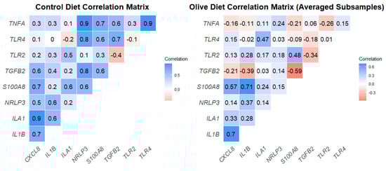 Correlation coefficients showed differences between the two diets, as shown in Figure 7. In group C, there were only positive correlation coefficients, with specific pairs of genes exhibiting strong positive correlations (Table 5). On the other hand, the correlations in group T were weak or moderate, and, in contrast to the control diet, there were also negative correlations (Figure 7).