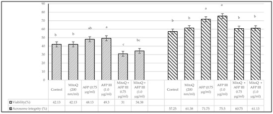 Impact of MitoQ and antifreeze protein III on viability and acrosome integrity of frozen–thawed canine sperm. The SD of the mean values presented in the figure are as follows: viability (4.95, 5.09, 4.66, 5.65, 2.84 and 3.81) and acrosome integrity (3.54, 4.38, 3.54, 2.75, 3.32 and 3.09), respectively, for each treatment from the control to the last (n = 8). a–c Values with different superscripts are different (p < 0.05).