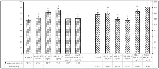 Regarding lipid peroxidation, Figure 2 presents result consistent with those for membrane integrity in frozen–thawed sperm, showing significant differences (p < 0.05) in diluents supplemented with 0.75 and 1.0 µg/mL AFP III compared with other treatments and the control group. Furthermore, the extender containing 1.0 µg/mL AFP III tended to have higher values than the treatment with 0.75 µg/mL AFP III.