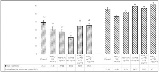 Impact of MitoQ and AFP III on ROS-H2O2 levels and mitochondrial membrane potential in frozen–thawed canine sperm (n = 8). The SD of the mean values presented in the figure are as follows: ROS-H2O2 levels (2.11, 5.33, 4.02, 2.95, 5.30, 5.29) and mitochondrial membrane potential (8.47, 7.82, 6.85, 7.84, 10.48, 11.10), respectively, for each treatment from the control to the last (n = 8). a,b Values with different superscripts are different (p < 0.05).