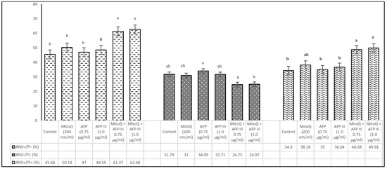 Impact of MitoQ and AFP III on Annexin+/PI− (apoptotic), Annexin−/PI− (living), and Annexin+/PI+ (dead) cells of frozen–thawed canine sperm. The SD of the mean values presented in the figure are as follows: apoptotic cells (3.55, 4.12, 4.30, 5.16, 4.13, 3.78), living cells (3.07, 3.09, 3.24, 3.74, 3.00, 1.85), and dead cells (2.83, 2.86, 2.77, 3.15, 3.67, 3.30), respectively, for each treatment from the control to the last (n = 8). a,b Values with different superscripts are different (p < 0.05).